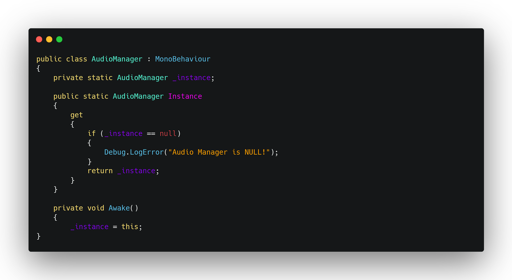 The design pattern I really got comfortable with was the singleton pattern. During a group project for ICS 485 Video Game Design and Development, we built an RPG called Belonging using Unity. It was my first time ever using Unity, so learning how everything works was a job in itself. I was the person in charge of actually making the soundtrack for our game, which was chill work at first because I mainly worked in MuseScore(the application I use to make the music). However, I did end up having to use Unity so I can add the music into our game. We needed the background music to flow smoothly between scenes. At first, every new scene kept starting with a fresh audio source. It was like having multiple DJs jumping in at random, all trying to play their own tracks. After much research, using the Singleton pattern, I created a single AudioManager that persisted across scenes. This allowed for the music to stay in sync and keep playing between scenes unless the area changed the music.