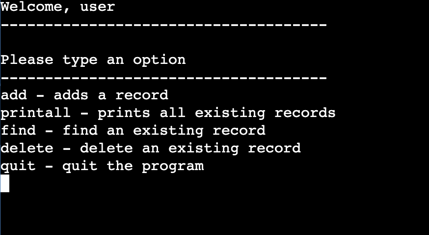 Unfortunately this project was done on UNIX, so we worked on this through terminal, so there’s no ‘nice’ user interface.